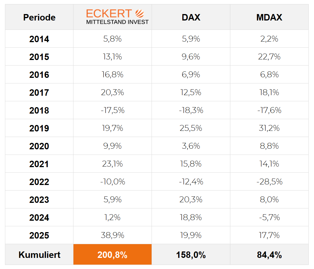 Wir sind spezialisiert auf die unabhängige und nachhaltige Vermögensverwaltung für Unternehmer. Unsere Kunden haben ihr Vermögen im Rahmen der Gründung oder Führung eines mittelständischen Unternehmens aufgebaut. Dieser Erfolg wird fortgeführt, indem wir für sie in andere herausragende Mittelständler investieren. Dabei bieten wir jedem Kunden ein individuelles Portfolio mit den besten mittelständischen Aktien im deutschsprachigen Raum.